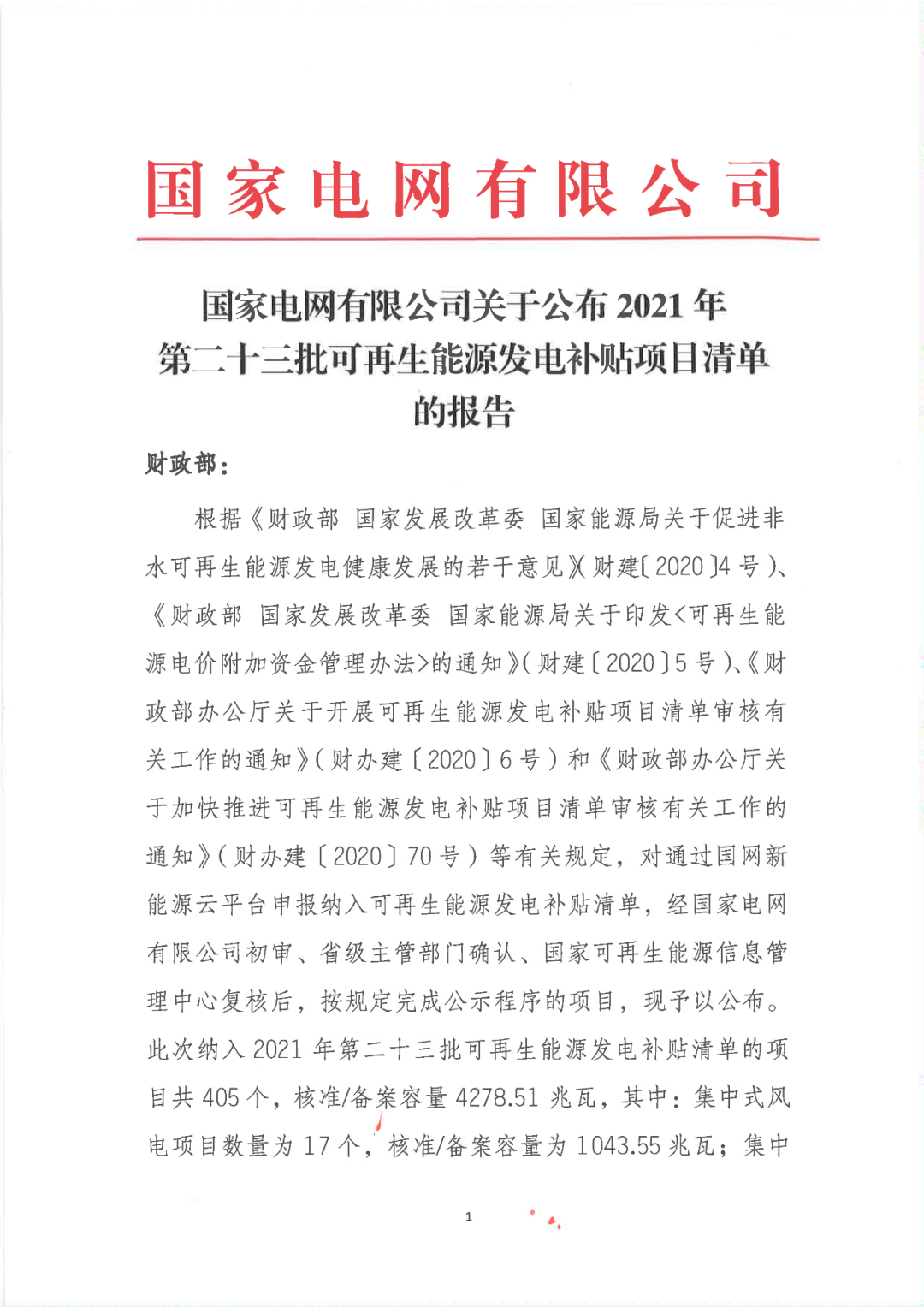 關(guān)于公布2021年第二十三批可再生能源發(fā)電補貼項目清單的公告 根據(jù)《財政部 國家發(fā)展改革委 國家能源局關(guān)于促進非水可再生能源發(fā)電健康發(fā)展的若干意見》(財建〔2020〕4號)、《財政部 國家發(fā)展改革委 國家能源局關(guān)于印發(fā)<可再生能源電價附加資金管理辦法>的通知》(財建〔2020〕5號)、《...