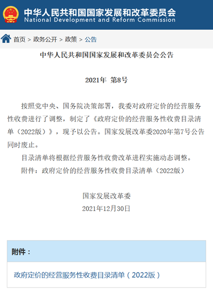 國家發(fā)展改革委官網(wǎng)1月6日消息,2021年12月30日,發(fā)改委發(fā)布《中華人民共和國國家發(fā)展和改革委員會(huì)公告》(2021年 第8號(hào)),按照黨中央、國務(wù)院決策部署,國家發(fā)展改革委對(duì)政府定價(jià)的經(jīng)營服務(wù)性收費(fèi)進(jìn)行了調(diào)整,制定并發(fā)布《政府定價(jià)的經(jīng)營服務(wù)性收費(fèi)目錄清單(2022版)》。 目錄清單中涉及北京、山西...