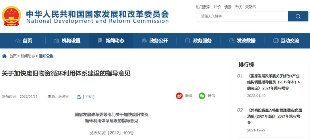 近日,國家發(fā)展改革委、商務(wù)部、工業(yè)和信息化部、財(cái)政部、自然資源部、生態(tài)環(huán)境部和住房城鄉(xiāng)建設(shè)部聯(lián)合印發(fā)《關(guān)于加快廢舊物資循環(huán)利用體系建設(shè)的指導(dǎo)意見》(發(fā)改環(huán)資﹝2022﹞109號(hào),《指導(dǎo)意見》提出,到2025年,廢舊物資回收網(wǎng)絡(luò)體系基本建立,建成綠色分揀中心1000個(gè)以上。 《指導(dǎo)意見》強(qiáng)調(diào),建立健全...