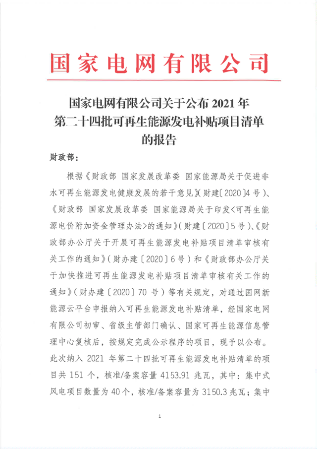 關于公布2021年第二十四批可再生能源發(fā)電補貼項目清單的公告 根據(jù)《財政部 國家發(fā)展改革委 國家能源局關于促進非水可再生能源發(fā)電健康發(fā)展的若干意見》(財建〔2020〕4號)、《財政部 國家發(fā)展改革委 國家能源局關于印發(fā)<可再生能源電價附加資金管理辦法>的通知》(財建〔2020〕5號)、《...