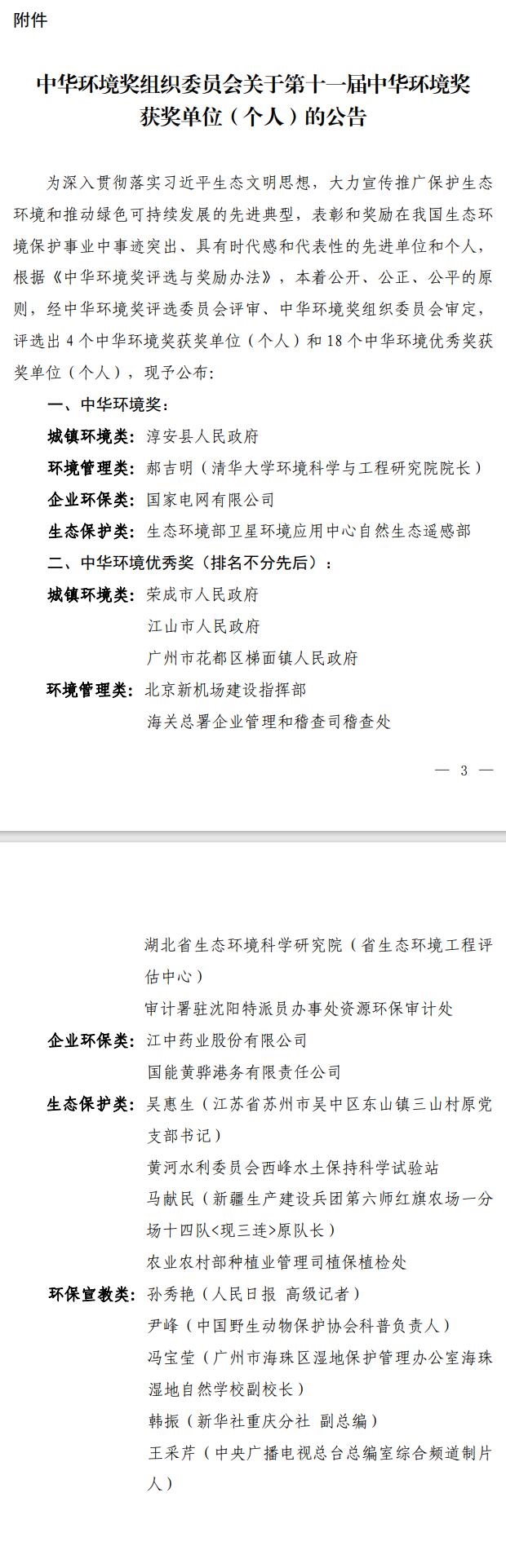 關(guān)于公布第十一屆中華環(huán)境獎評選結(jié)果的通知 國務(wù)院各有關(guān)部門辦公廳(室),各省、自治區(qū)、直轄市和計劃單列市生態(tài)環(huán)境廳(局): 為深入貫徹落實習(xí)近平生態(tài)文明思想,大力宣傳推廣保護生態(tài)環(huán)境和推動綠色可持續(xù)發(fā)展的先進典型,堅決打好污染防治攻堅戰(zhàn),建設(shè)美麗中國,促進人與自然和諧共生,由全國人大環(huán)資委、全國政協(xié)...