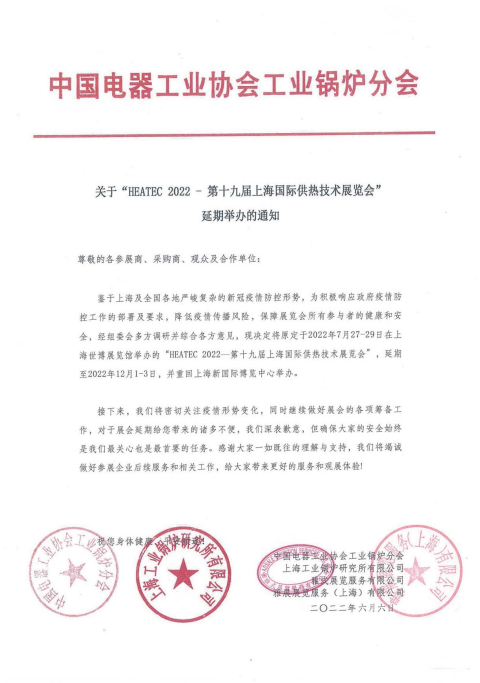 關(guān)于“HEATEC2022—第十九屆上海國(guó)際供熱技術(shù)展覽會(huì)”延期舉辦的通知尊敬的各參展商、采購(gòu)商、觀眾及合作單位: 鑒于上海及全國(guó)各地嚴(yán)峻復(fù)雜的疫情防控形勢(shì),為積極響應(yīng)政府疫情防控工作的部署及要求,降低疫情傳播風(fēng)險(xiǎn),保障展覽會(huì)所有參與者的健康和安全,經(jīng)組委會(huì)多方調(diào)...