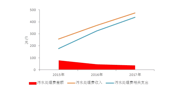 市政污水市場(chǎng)化進(jìn)程中,城市縣城污水處理設(shè)施建設(shè)不斷趨于飽和,且污水處理費(fèi)與自來(lái)水費(fèi)被綁定一起進(jìn)行收繳,污水處理費(fèi)相對(duì)穩(wěn)定可控,從國(guó)家層面看,三年以來(lái)全國(guó)污水處理費(fèi)收入一直大于支出,而兩者差額在逐漸減少。