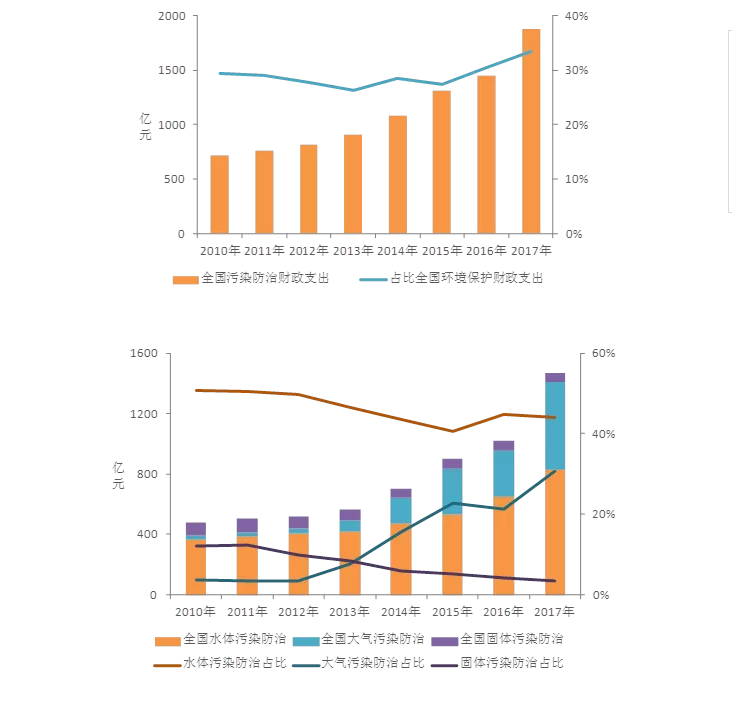 近兩年,全國(guó)污染防治公共預(yù)算支出占比全國(guó)環(huán)境保護(hù)公共預(yù)算支出在小幅提升。與水污染防治、大氣污染防治相比,全國(guó)固體廢物污染防治支出呈逐年持續(xù)下降趨勢(shì);從2013年開始,大氣污染防治財(cái)政支出占比呈現(xiàn)劇烈增加;而水體污染防治支出從2010年-2015年不斷下降,受水十條等政策影響,2016年-2017年水污染防治財(cái)政支出占比逐漸回升。
