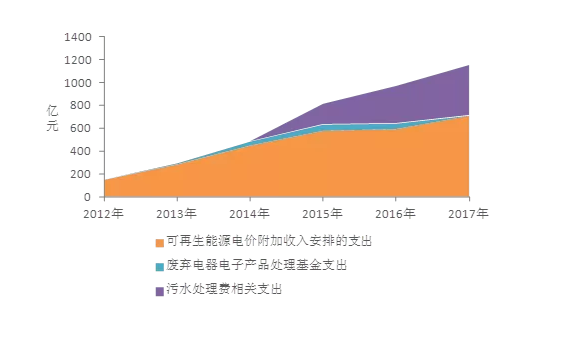 從2012年至2015年,可再生能源支出攀升速度較快,而從2015年至2017年每年該項(xiàng)支出逐漸穩(wěn)定。廢棄電器電子產(chǎn)品支出從2012年至2015年穩(wěn)步提高,而從2016年開始逐漸下降,2017年更是迅速衰減。而全國(guó)污水處理費(fèi)從2015年明確列支開始,即呈現(xiàn)穩(wěn)步增加趨勢(shì)。