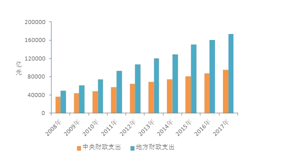 一般公共預(yù)算支出從兩個(gè)層面展開,中央一般公共預(yù)算支出、地方一般公共預(yù)算支出。2008年至2017年,中央公共預(yù)算支出增加1.6倍、地方公共預(yù)算支出增加2.5倍。