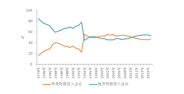 全國(guó)公共預(yù)算收入等于中央公共預(yù)算收入加地方公共預(yù)算本級(jí)收入。1994年分稅制改革前,一多半公共預(yù)算收入被地方占有,中央占比一直低于40%;中央占比全國(guó)的數(shù)字,1994年接近1978年,約20%左右。1994年分稅制改革后,中央與地方分別占比全國(guó)公共預(yù)算收入均在50%左右;在國(guó)家公共預(yù)算收入構(gòu)成中,中央與地方呈現(xiàn)分庭抗禮的局面。