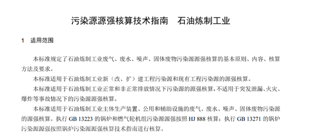 本標(biāo)準(zhǔn)規(guī)定了石油煉制工業(yè)廢氣、廢水、噪聲、固體廢物污染源強核算的基本原則、內(nèi)容、核算方法及要求等。