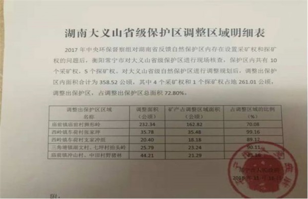 不過,督察還發(fā)現(xiàn),衡陽市國土資源局2017年3月向市政府建議“如大義山自然保護區(qū)的范圍尚未最終確定,確定范圍時應當避開該探礦權;如已最終確定,也應爭取調整保護區(qū)范圍,將該探礦權調出保護區(qū)”,衡陽市政府對此表示同意,并要求相關縣市區(qū)認真落實。