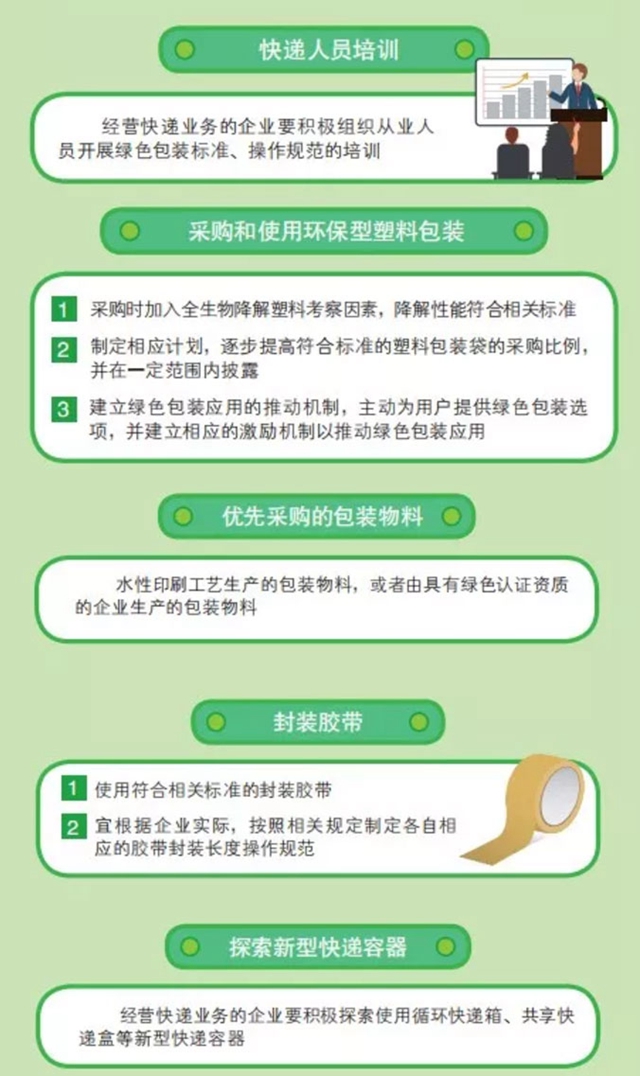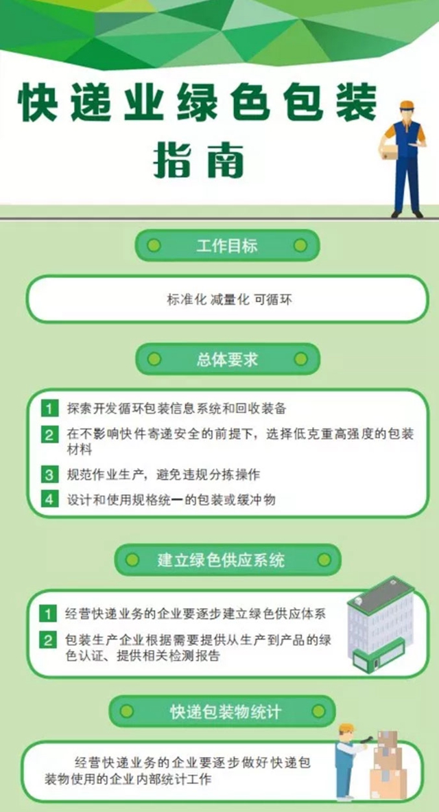 為貫徹落實習(xí)近平生態(tài)文明思想,打好郵政業(yè)污染防治攻堅戰(zhàn),指導(dǎo)經(jīng)營快遞業(yè)務(wù)的企業(yè)做好綠色包裝工作,根據(jù)《快遞暫行條例》等有關(guān)規(guī)定,國家郵政局制訂發(fā)布了《快遞業(yè)綠色包裝指南(試行)》(以下簡稱《指南》),規(guī)定了行業(yè)綠色包裝工作的目標,即快遞業(yè)綠色包裝堅持標準化、減量化和可循環(huán)的工作目標,加強與上下游協(xié)同,逐步實現(xiàn)包裝材料的減量化和再利用。