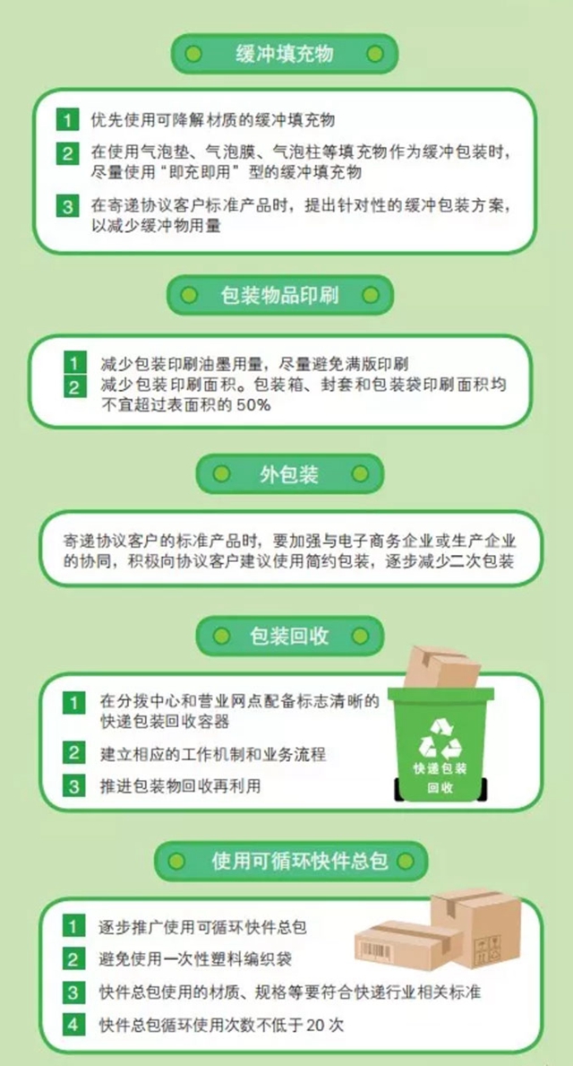 《指南》指出行業(yè)綠色包裝工作的總體要求是,經(jīng)營快遞業(yè)務(wù)的企業(yè)應(yīng)當(dāng)按照規(guī)定使用環(huán)保包裝材料。在不影響快件寄遞安全的前提下,逐步選擇低克重高強度的包裝材料,設(shè)計和使用規(guī)格統(tǒng)一的包裝或緩沖物;堅持規(guī)范作業(yè)生產(chǎn),避免違規(guī)分揀操作;探索開發(fā)使用循環(huán)包裝信息系統(tǒng)和回收裝備。