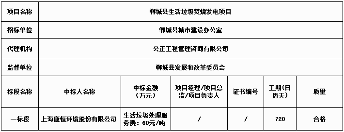 河南省周口市鄲城縣生活垃圾焚燒發(fā)電項目發(fā)布了中標(biāo)公告,上??岛悱h(huán)境股份有限公司成為中標(biāo)的社會資本方,生活垃圾處理服務(wù)費為60元/噸。