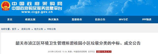 原標題:中國天楹中標99.98萬韶關(guān)碧桂園小區(qū)垃圾分類項目
