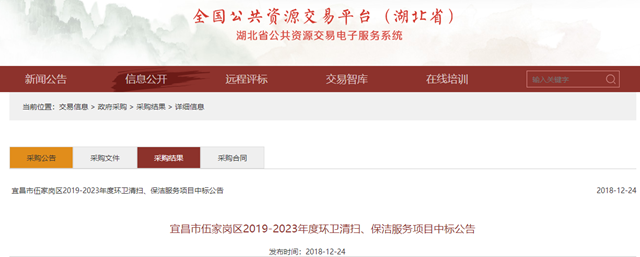 2018年12月24日,湖北省宜昌市伍家崗區(qū)2019-2023年度環(huán)衛(wèi)清掃、保潔服務(wù)項(xiàng)目中標(biāo)公告出爐,北控水務(wù)(中國)投資有限公司成為中標(biāo)的社會(huì)資本方,中標(biāo)金額為2.24億。