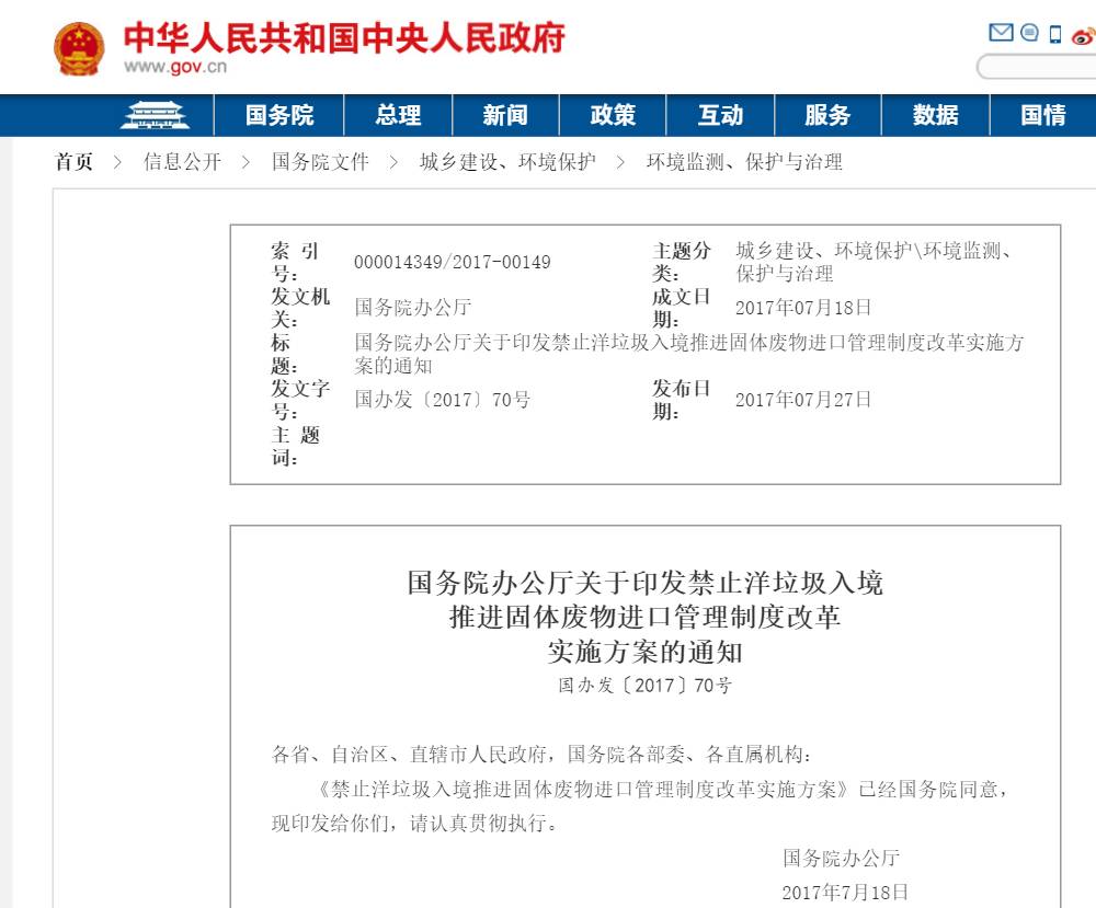 7月27日,國務院辦公廳正式發(fā)布禁止洋垃圾入境推進固體廢物進口管理制度改革實施方案。明確2017年年底前,全面禁止進口環(huán)境危害大、群眾反映強烈的固體廢物;2019年年底前,逐步停止進口國內資源可以替代的固體廢物。