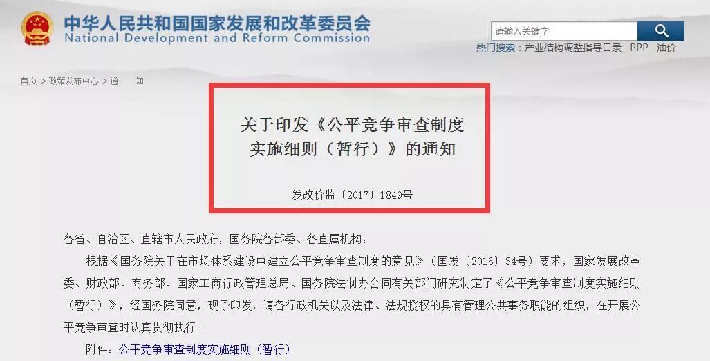 關(guān)于印發(fā)《公平競(jìng)爭(zhēng)審查制度實(shí)施細(xì)則(暫行)》的通知