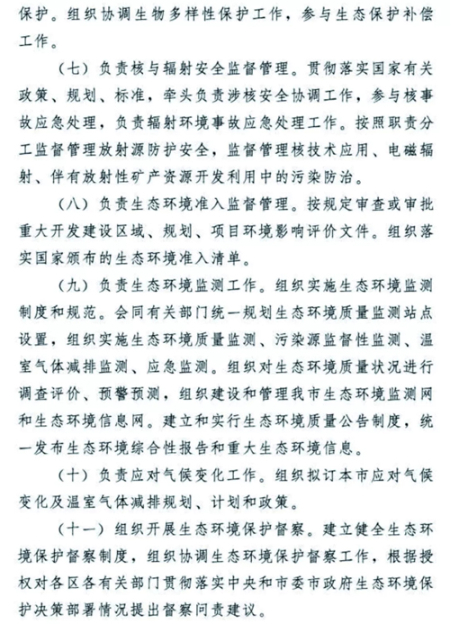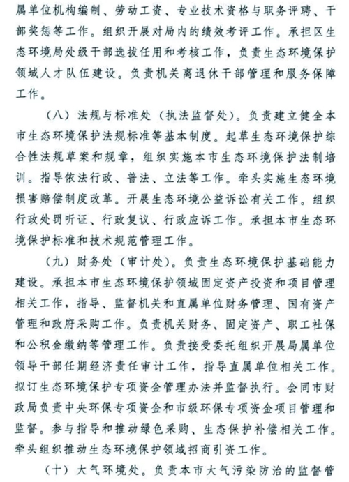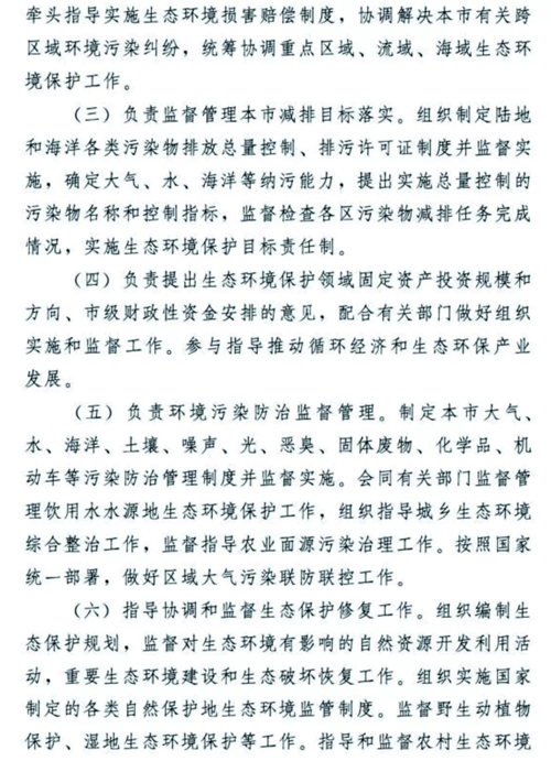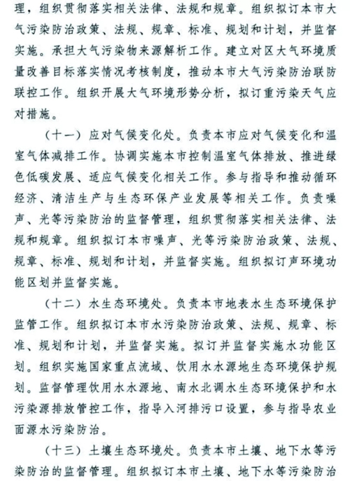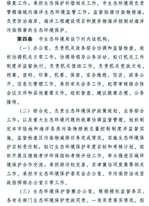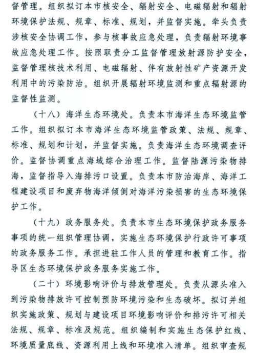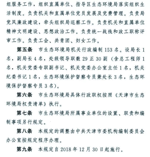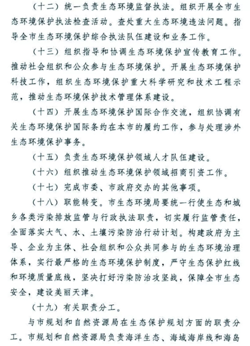 天津生態(tài)環(huán)境保護(hù)機(jī)構(gòu)改革懸念落地,方案正式揭蓋!2018年12月30日,天津市委市政府發(fā)布了《天津市生態(tài)環(huán)境局職能配置、內(nèi)設(shè)機(jī)構(gòu)和人員編制規(guī)定》。無(wú)論是職能配置,還是內(nèi)設(shè)機(jī)構(gòu)、人員編制,都比此前坊間傳聞的變化更多更大,也凸顯了“茲事”確實(shí)“體大”,更表明了新時(shí)期生態(tài)環(huán)境保護(hù)使命之重、任務(wù)之重!天津市生態(tài)環(huán)境局責(zé)任之重、擔(dān)子之重!我們堅(jiān)信,天津市生態(tài)環(huán)境局全體干部職工,一定會(huì)在市委市政府正確堅(jiān)強(qiáng)的領(lǐng)導(dǎo)下,全面深入貫徹落實(shí)習(xí)近平生態(tài)文明思想,擔(dān)當(dāng)作為,不辱使命,盡心盡力盡職盡責(zé)開(kāi)創(chuàng)天津生態(tài)環(huán)境保護(hù)新局面,推動(dòng)天津生態(tài)文明建設(shè)取得新發(fā)展!