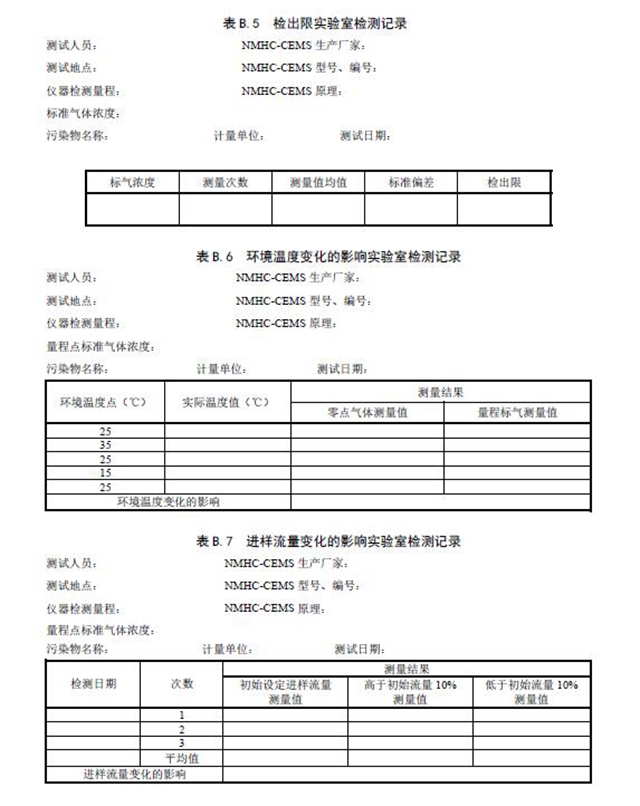 固定污染源廢氣NMHC-CEMS 實驗室檢測項目見表3 和表4,廢氣參數(shù)現(xiàn)場檢測項目見表5。相關(guān)記錄表格見附錄B。