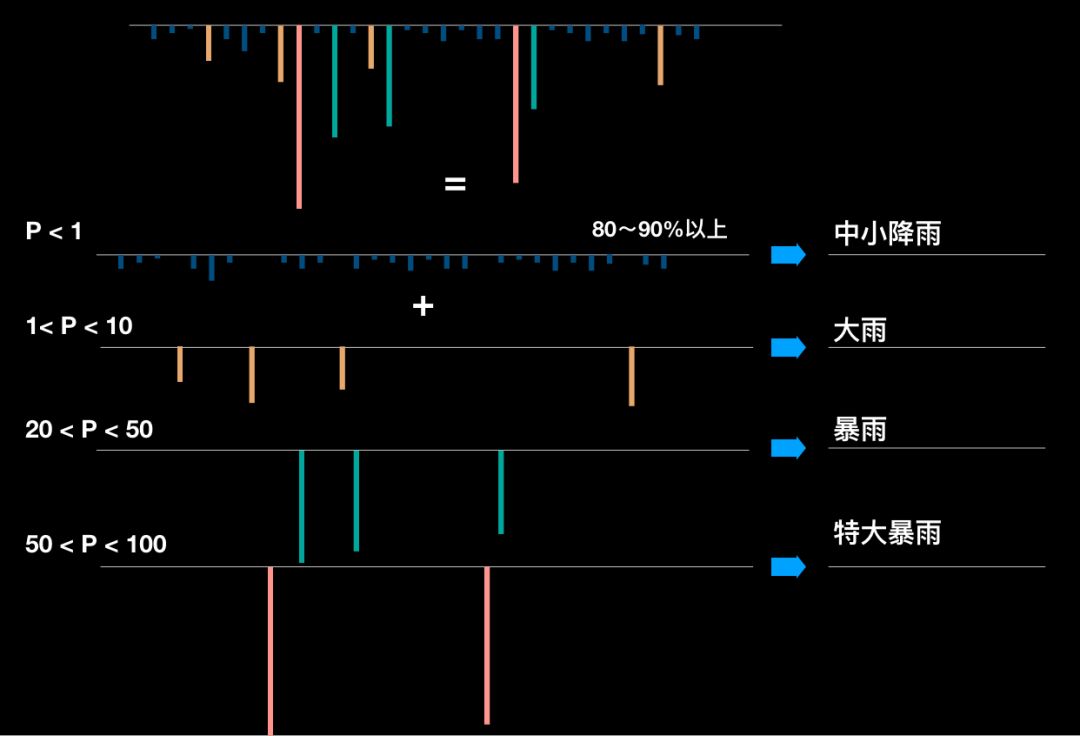 我們現(xiàn)在來看看怎么科學(xué)地界定這些雨水。我們把雨水用非?!皩I(yè)”的術(shù)語給分類,叫小雨、中雨、大雨和暴雨。這樣分實(shí)際上是有道理的,因?yàn)橐粋€知識點(diǎn):重現(xiàn)期。