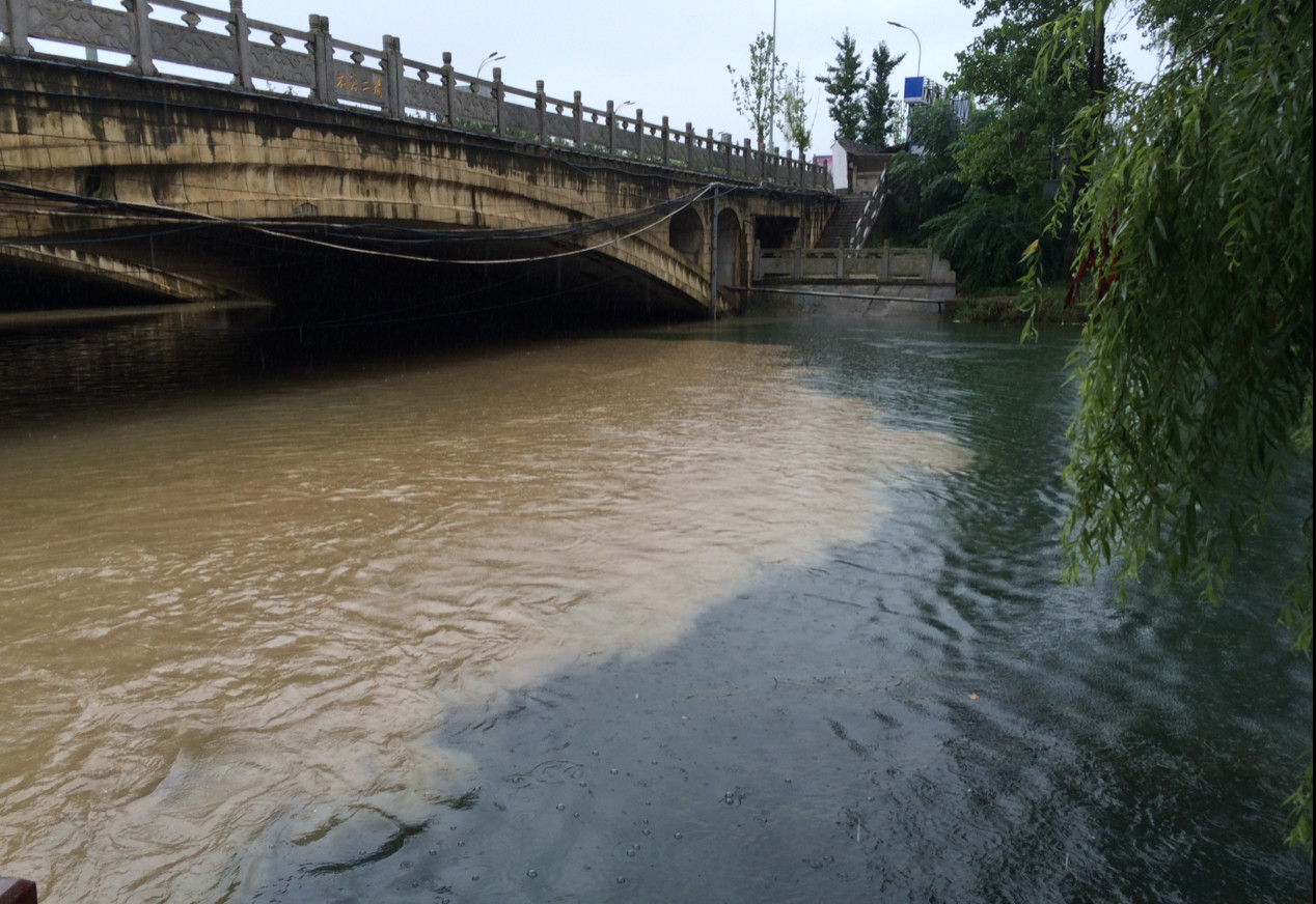 這是貴陽的南明河,是我老師拍的。整個南明河本來是很清澈的,水質(zhì)特別好,有人釣魚,有人游泳。但是一場雨下來以后,所有的污水、雨水都集中在一個口里,漫出去了,這個河道就沒法要了。