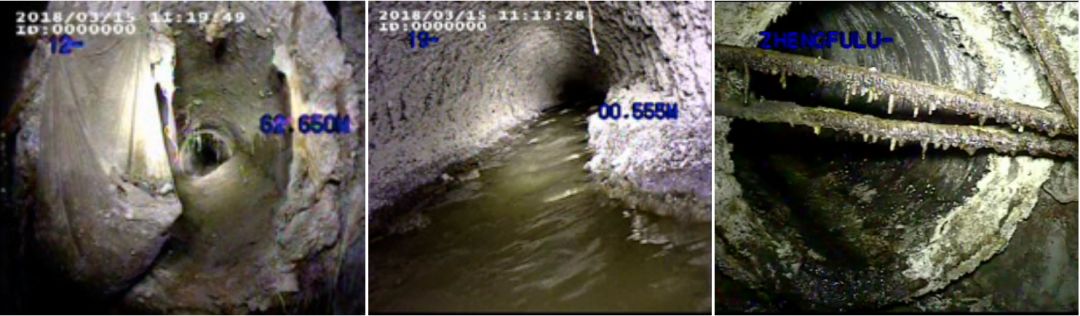 這幾張就是在剛才那個冒出很多污水的農(nóng)貿(mào)市場下面拍的。最左邊這種叫沉積和堵塞,這么大的井口縮成了這么點(diǎn)。第二個是鋼筋混凝土的腐蝕,就像我們的血管被腐蝕了。第三個是建筑垃圾,有時(shí)會損壞管道,形成穿刺。