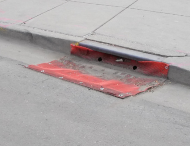 這里有大量的綠植,那每次掃完的葉子去哪兒了呢?下雨沖到哪兒呢?我們看它邊上的這個溝,很小、很窄,水在這個位置漏到管里,篦子會把葉子擋在外面。