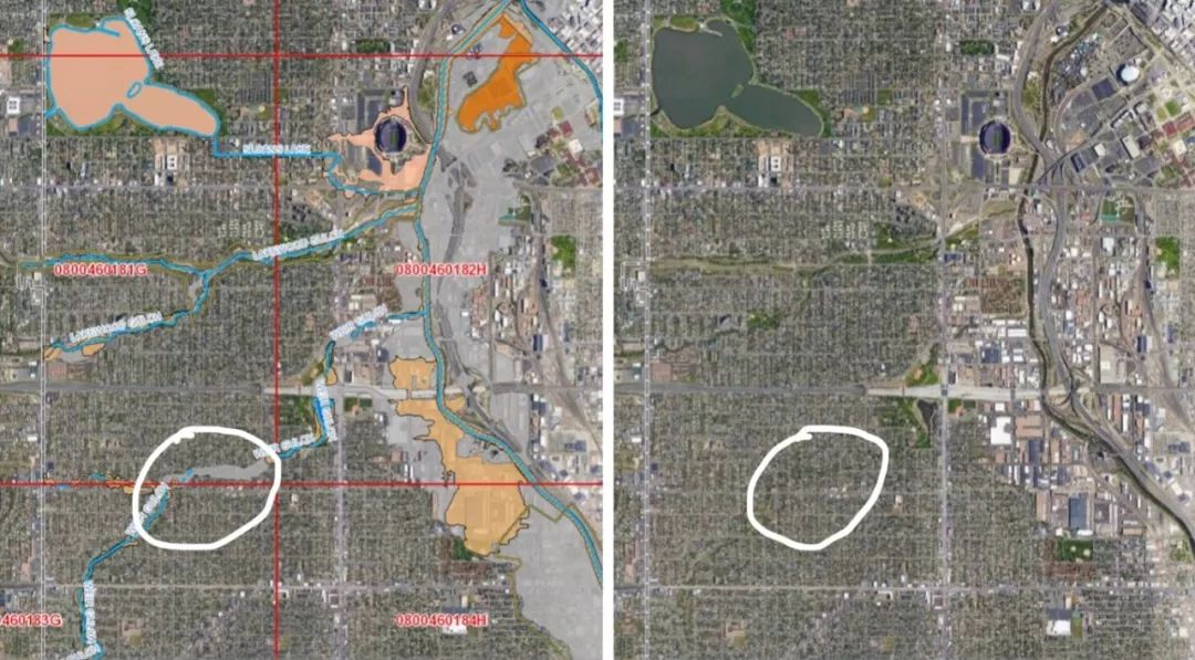 我們可以注意到中間有一個體育館,這個體育館在暴雨的時(shí)候是會被淹沒的。