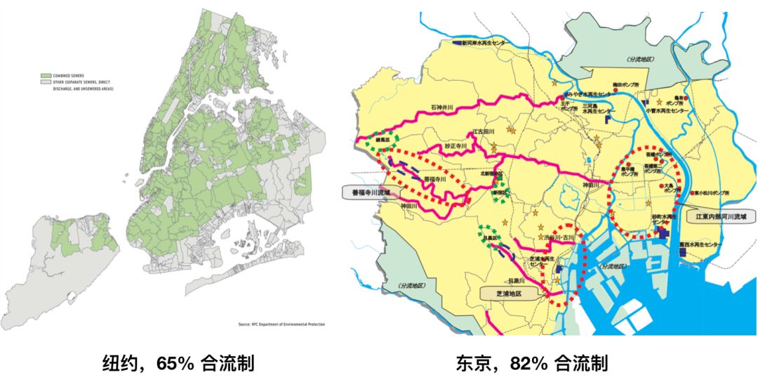我們來看看世界上其他城市。紐約2008年的數(shù)據(jù)里,有65%的區(qū)域是合流制區(qū)域,東京有82%的區(qū)域是合流制區(qū)域。