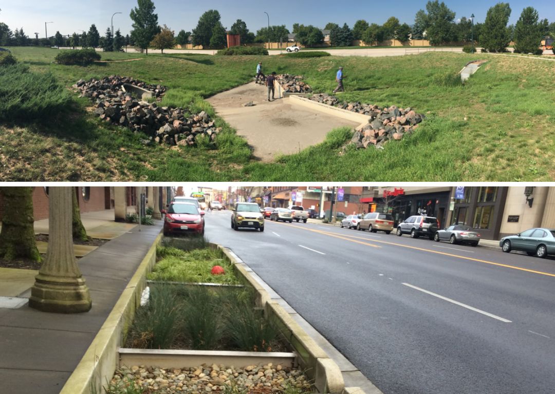 這張圖片也是丹佛。我們剛才說在綠地和綠地之間,預(yù)留出徑流的通道,方法很簡單,讓兩邊道路往中間傾斜,開幾個小孔,就有了水可以走的路線。