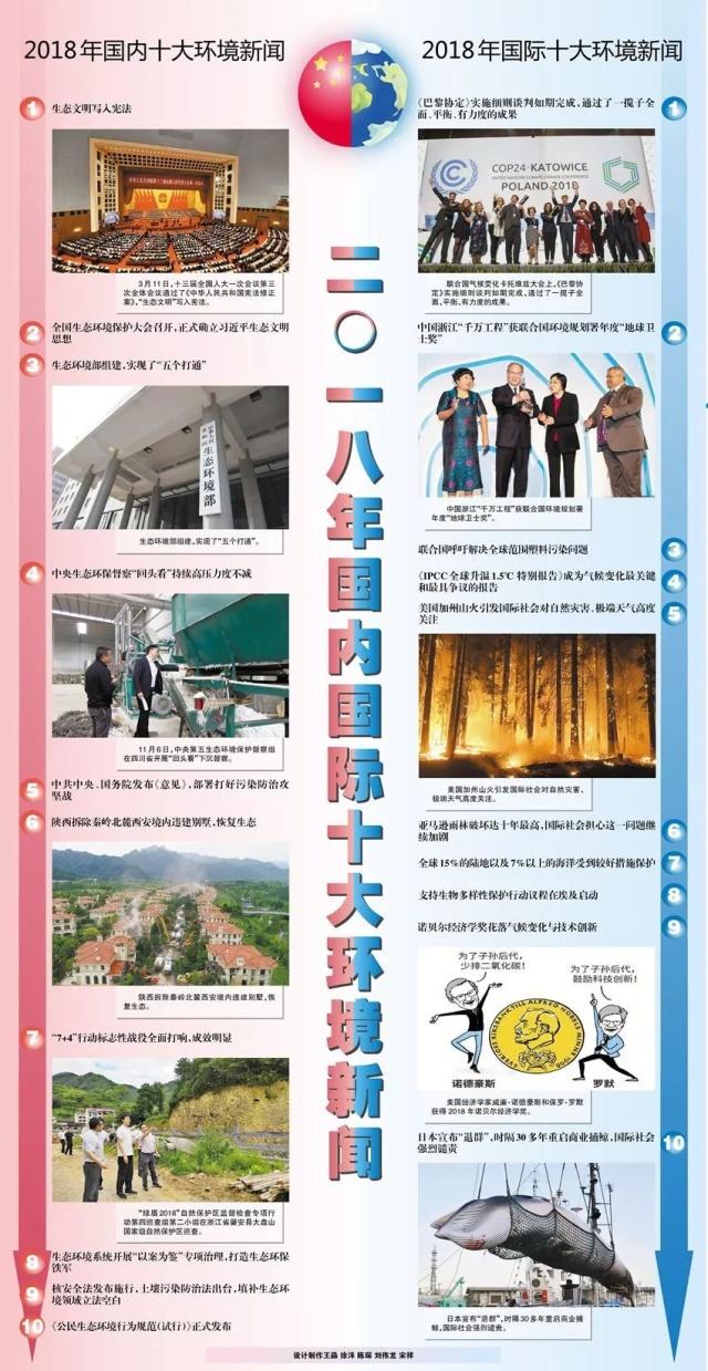 本次評出的2018年度國內(nèi)十大環(huán)境新聞是:生態(tài)文明寫入憲法;全國生態(tài)環(huán)境保護大會召開,正式確立習近平生態(tài)文明思想;生態(tài)環(huán)境部組建,實現(xiàn)了“五個打通”;中央生態(tài)環(huán)保督察“回頭看”持續(xù)高壓力度不減;中共中央國務院發(fā)布《意見》,部署打好污染防治攻堅戰(zhàn);陜西拆除秦嶺北麓西安境內(nèi)違建別墅,恢復生態(tài);“7+4”行動標志性戰(zhàn)役全面打響,成效明顯;生態(tài)環(huán)境系統(tǒng)開展“以案為鑒”專項治理,打造生態(tài)環(huán)保鐵軍;核安全法發(fā)布施行,土壤污染防治法出臺,填補生態(tài)環(huán)境領(lǐng)域立法空白;《公民生態(tài)環(huán)境行為規(guī)范(試行)》正式發(fā)布。