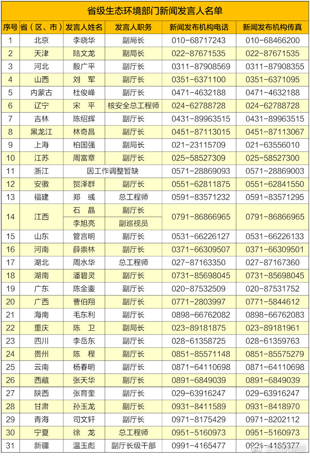 更新發(fā)布31個(gè)省級(jí)環(huán)境部門(mén)發(fā)言人名單:歡迎媒體朋友們聯(lián)系他們