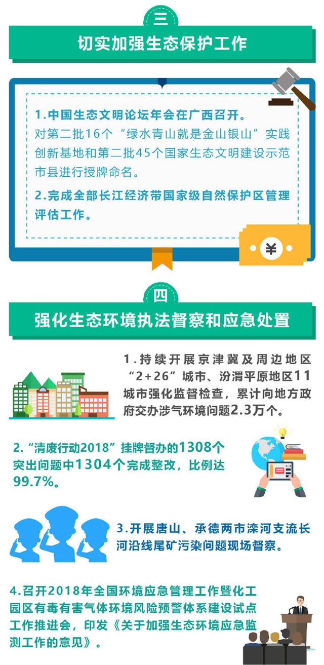例如:召開(kāi)全面從嚴(yán)治黨第一次專題會(huì)議,研究近年來(lái)生態(tài)環(huán)境部貫徹落實(shí)中央八項(xiàng)規(guī)定精神情況;持續(xù)推進(jìn)全國(guó)集中式飲用水水源地環(huán)境整治;印發(fā)《生態(tài)環(huán)境損害鑒定評(píng)估技術(shù)指南土壤與地下水》《汾渭平原、長(zhǎng)三角地區(qū)城市環(huán)境空氣降塵監(jiān)測(cè)方案》;召開(kāi)第二次全國(guó)污染源普查暨全國(guó)土壤污染狀況詳查工作推進(jìn)視頻會(huì);完成全部長(zhǎng)江經(jīng)濟(jì)帶國(guó)家級(jí)自然保護(hù)區(qū)管理評(píng)估工作;“清廢行動(dòng)2018”掛牌督辦的1308個(gè)突出問(wèn)題中1304個(gè)完成整改,比例達(dá)到99.7%等等。