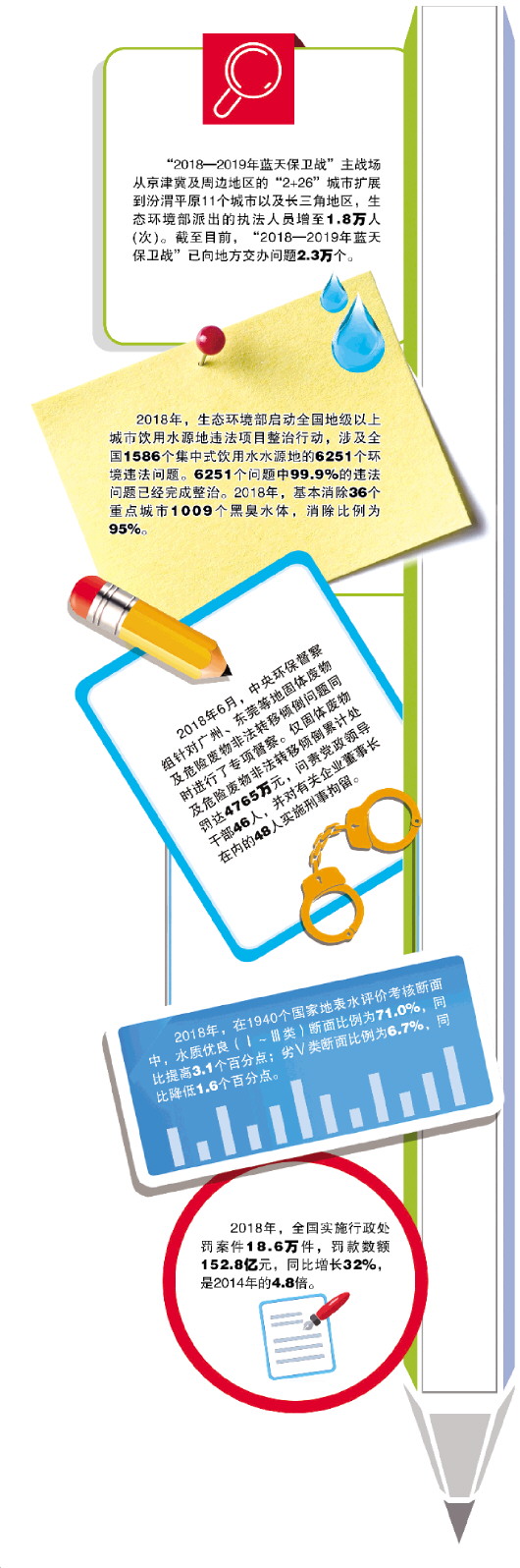 “2018年,全國實(shí)施行政處罰案件18.6萬件,罰款數(shù)額152.8億元,同比增長(zhǎng)32%,是2014年的4.8倍?!?p style="text-indent: 2em;">這一組數(shù)據(jù)是生態(tài)環(huán)境部部長(zhǎng)李干杰在近日召開的全國生態(tài)環(huán)境保護(hù)工作會(huì)議上公布的。李干杰說,2018年,所有約束性指標(biāo)年度目標(biāo)任務(wù)圓滿完成,達(dá)到“十三五”規(guī)劃序時(shí)進(jìn)度要求,生態(tài)環(huán)境質(zhì)量持續(xù)改善;2019年,除了啟動(dòng)第二輪中央生態(tài)環(huán)境保護(hù)督察以外,還將持續(xù)開展“藍(lán)天碧水凈土”三大保衛(wèi)戰(zhàn)。