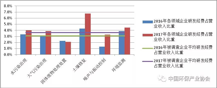 從創(chuàng)新能力看,被調(diào)查企業(yè)研發(fā)經(jīng)費(fèi)占營業(yè)收入的比重高于全國規(guī)模以上工業(yè)企業(yè)研發(fā)經(jīng)費(fèi)支出占營業(yè)收入的比重。與2016年相比,2017年相同樣本企業(yè)的平均研發(fā)經(jīng)費(fèi)支出、研發(fā)經(jīng)費(fèi)支出占營業(yè)收入的比重均有所提高。環(huán)保企業(yè)自主知識產(chǎn)權(quán)開發(fā)和技術(shù)創(chuàng)新活躍,具有高學(xué)歷、高級技術(shù)職稱的研發(fā)、管理及工程技術(shù)人員占比較高,人才基礎(chǔ)總體較好。
