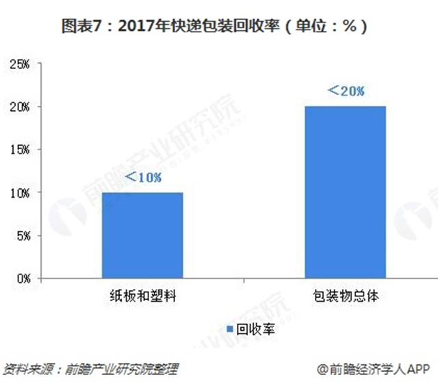 2017年,包裝快遞所用紙板和塑料實(shí)際回收率不到10%,包裝物總體回收率不到20%。