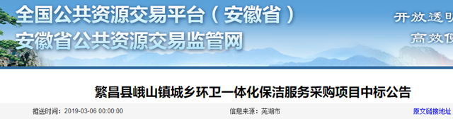 安徽省繁昌縣峨山鎮(zhèn)城鄉(xiāng)環(huán)衛(wèi)一體化保潔服務采購項目發(fā)布中標公告,蕪湖市鳩茲物業(yè)管理有限責任公司成為中標社會資本方,中標金額1001.43萬(5年)。