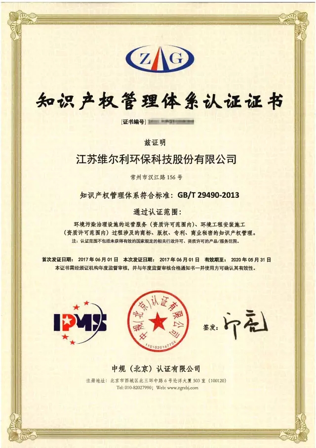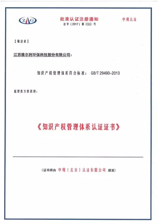 2017年6月,江蘇維爾利環(huán)??萍脊煞萦邢薰卷樌ㄟ^認(rèn)證,獲得GB/T29490-2013知識產(chǎn)權(quán)管理體系認(rèn)證證書。