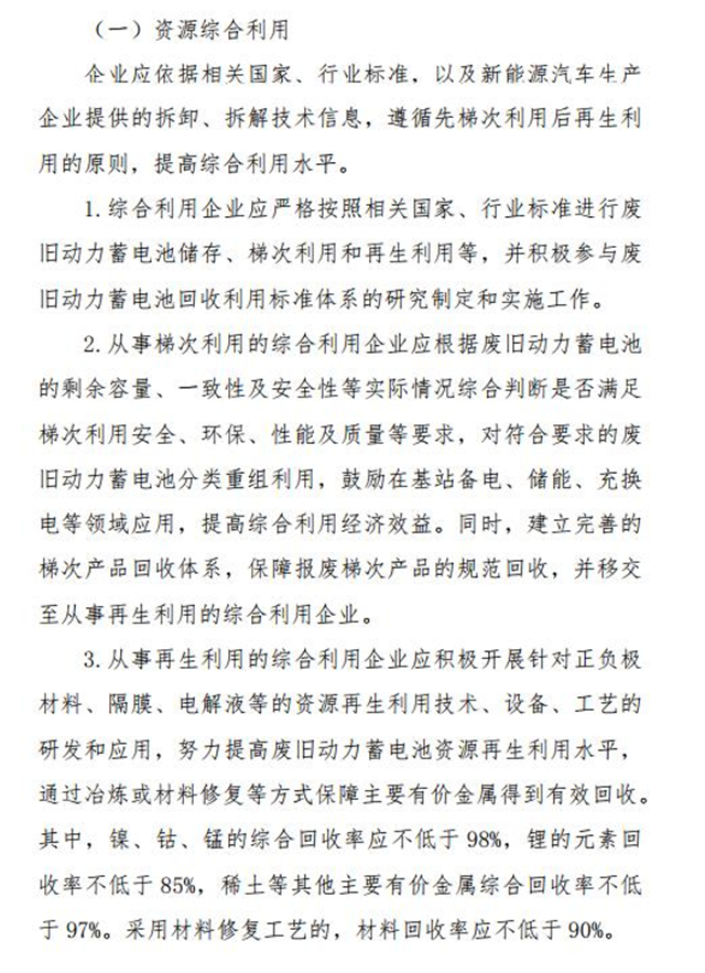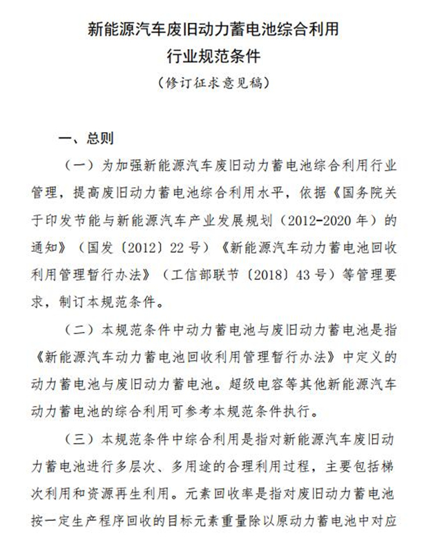 近日,節(jié)能與綜合利用司修訂了《新能源汽車廢舊動力蓄電池綜合利用行業(yè)規(guī)范條件(修訂征求意見稿)》和《新能源汽車廢舊動力蓄電池綜合利用行業(yè)規(guī)范公告管理暫行辦法(修訂征求意見稿)》,具體內(nèi)容見下文: