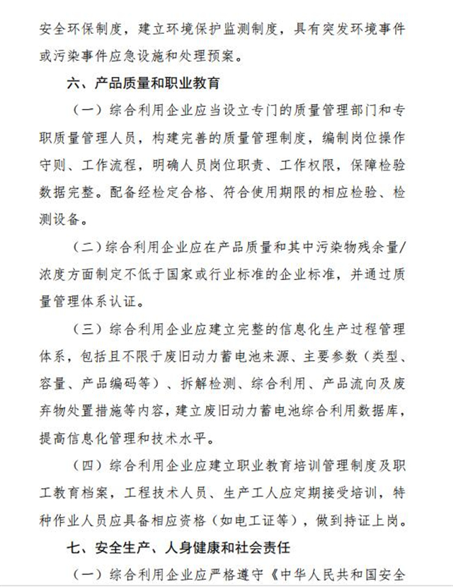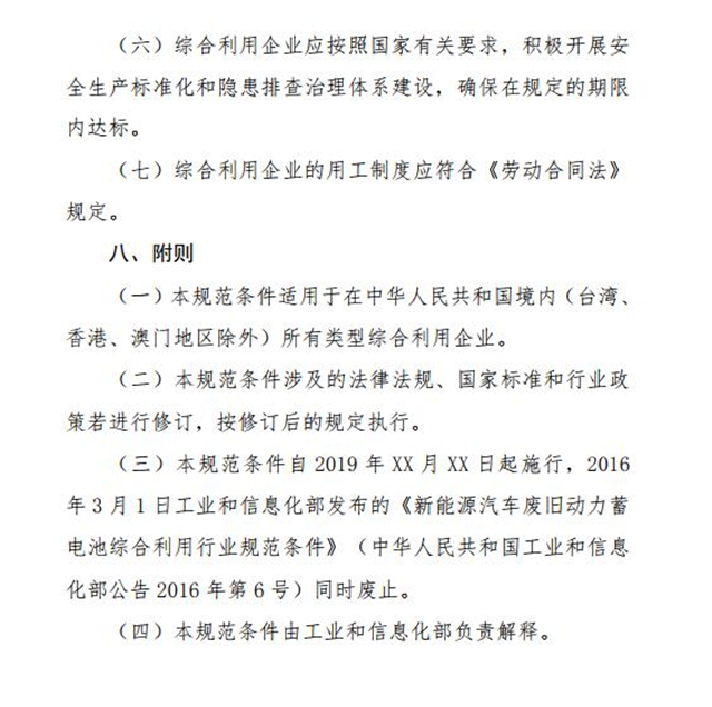 為推動新能源汽車動力蓄電池回收利用,適應行業(yè)發(fā)展新形勢,引導行業(yè)健康發(fā)展,在深入調(diào)研基礎上,工業(yè)和信息化部對2016年公告發(fā)布的《新能源汽車廢舊動力蓄電池綜合利用行業(yè)規(guī)范條件》《新能源汽車廢舊動力蓄電池綜合利用行業(yè)規(guī)范公告管理暫行辦法》進行了修訂?,F(xiàn)將修訂稿向社會公開征求意見,如有意見或建議,請于2019年10月30日前反饋工業(yè)和信息化部節(jié)能與綜合利用司。
