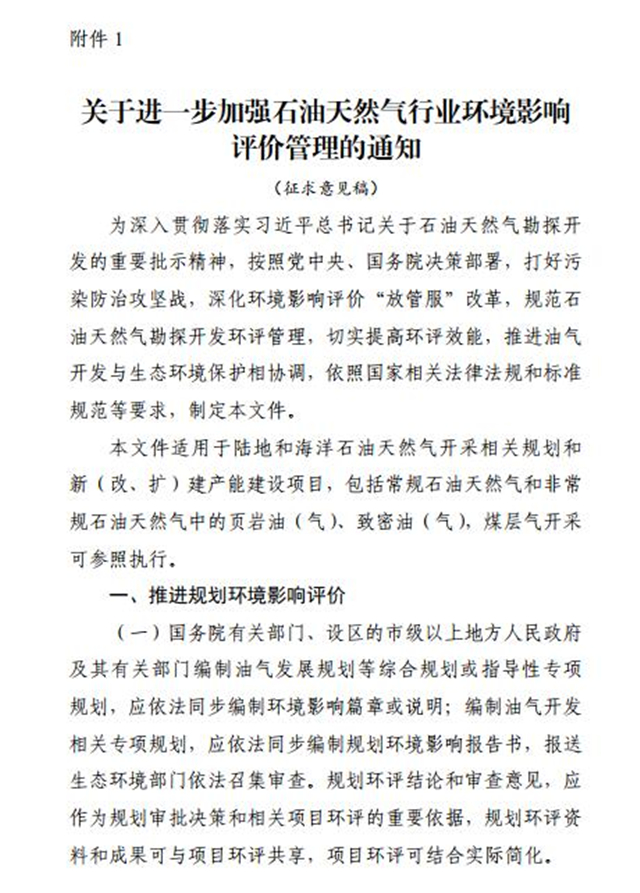 附件:1.《關(guān)于進(jìn)一步加強(qiáng)石油天然氣行業(yè)環(huán)境影響評(píng)價(jià)管理的通知(征求意見稿)》