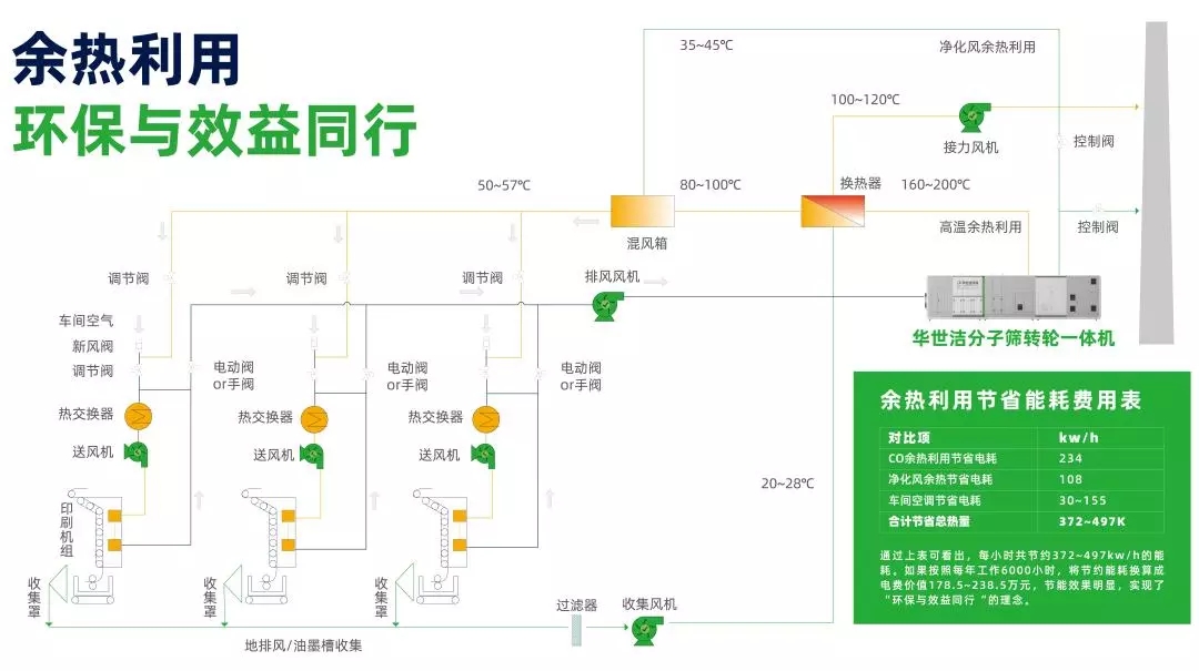 華世潔分子篩轉(zhuǎn)輪一體機(jī)采用先進(jìn)的“沸石轉(zhuǎn)輪吸附濃縮+催化氧化燃燒+余熱利用”的工藝。低溫條件下,大風(fēng)量的VOCs廢氣通過(guò)分子篩轉(zhuǎn)輪吸附后達(dá)標(biāo)排放。吸附有大量VOCs的轉(zhuǎn)輪旋轉(zhuǎn)進(jìn)入高溫脫附區(qū),形成小風(fēng)量的高濃度廢氣,送入后端的CO催化氧化系統(tǒng)進(jìn)行處理。CO凈化后的廢氣高溫的熱風(fēng)可通過(guò)換熱等方式進(jìn)行余熱利用。即開(kāi)即用,減少無(wú)組織濃度揮發(fā),徹底降低溶劑殘留。
