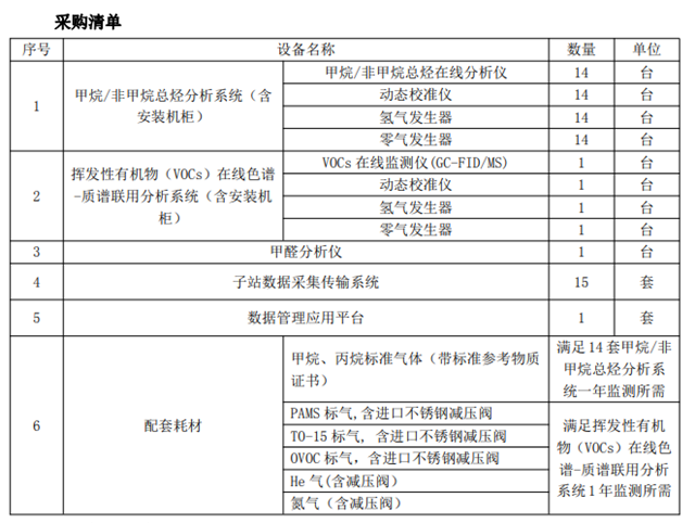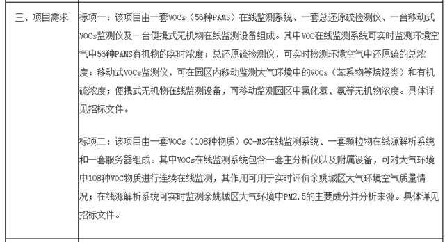 要求二:城區(qū)大氣環(huán)境空氣VOCs等污染物在線監(jiān)測設(shè)備。該項目由一套VOCs(108種物質(zhì))GC-MS在線監(jiān)測系統(tǒng)、一套顆粒物在線源解析系統(tǒng)和一套服務(wù)器組成。項目預算最高限價728萬元。
