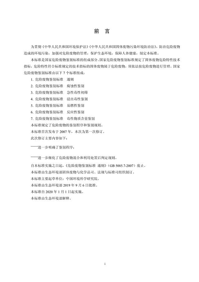 為貫徹《中華人民共和國環(huán)境保護(hù)法》《中華人民共和國固體廢物污染環(huán)境防治法》,防治污染,保護(hù)和改善生態(tài)環(huán)境,現(xiàn)批準(zhǔn)《危險(xiǎn)廢物鑒別標(biāo)準(zhǔn) 通則》為國家環(huán)境保護(hù)標(biāo)準(zhǔn),并由生態(tài)環(huán)境部與國家市場監(jiān)督管理總局聯(lián)合發(fā)布。