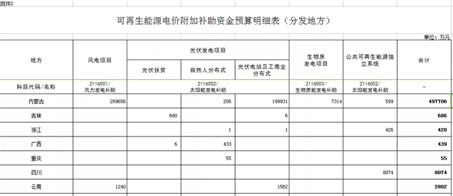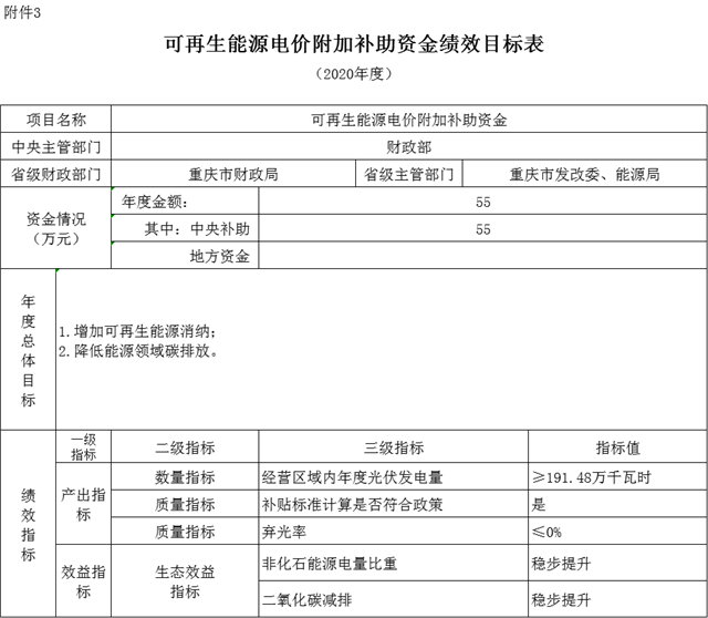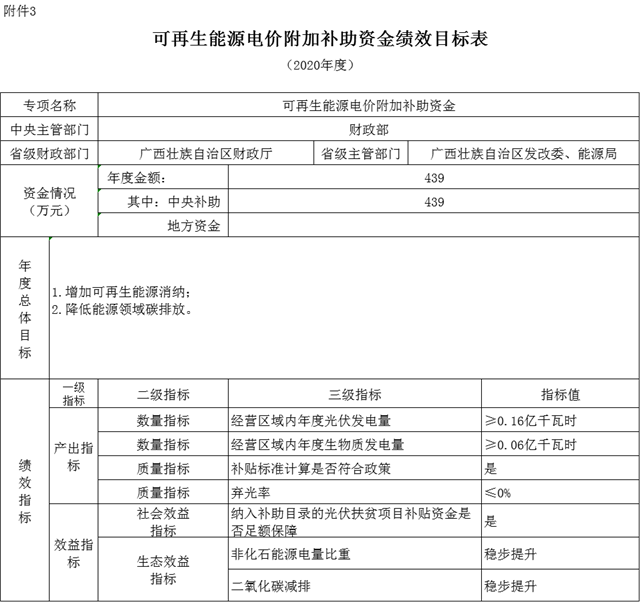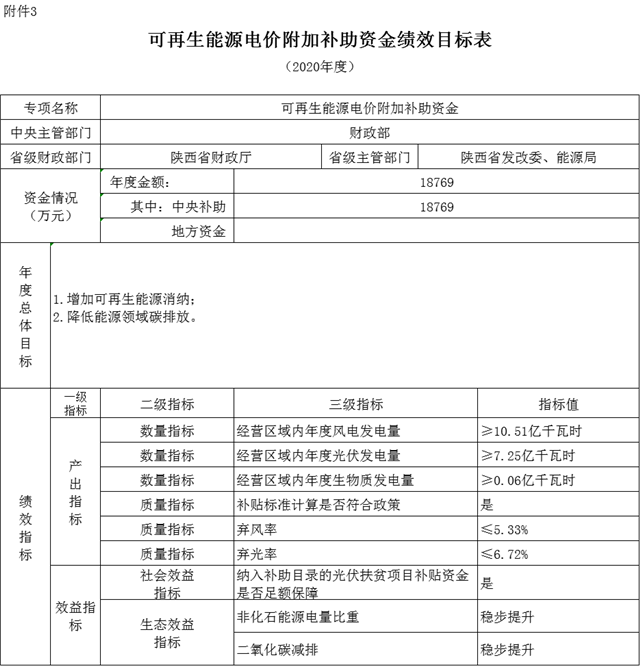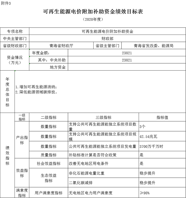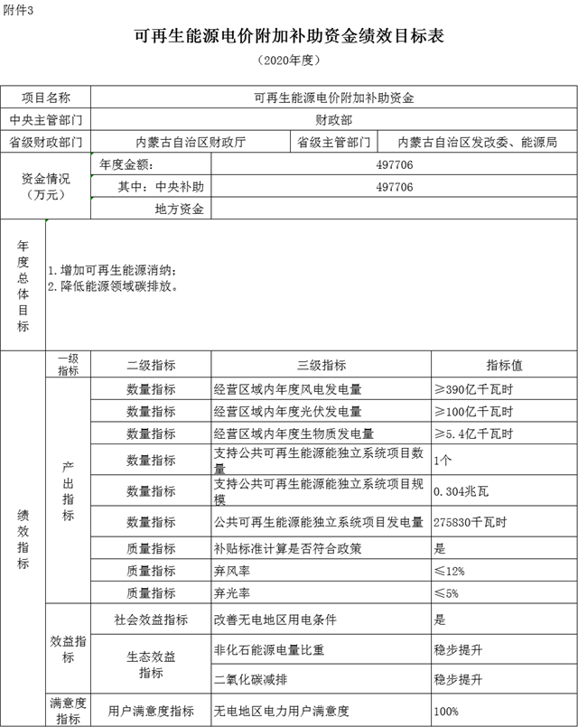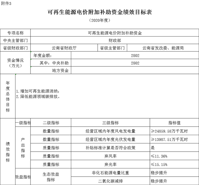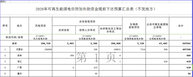 一、根據(jù)《資金管理辦法》、《財(cái)政部關(guān)于分布式光伏發(fā)電實(shí)行按照電量補(bǔ)貼政策等有關(guān)問題的通知》(財(cái)建〔2013〕390號(hào)),以及《關(guān)于公布可再生能源電價(jià)附加資金補(bǔ)助目錄(第一批)的通知》(財(cái)建〔2012〕344號(hào))、《關(guān)于公布可再生能源電價(jià)附加資金補(bǔ)助目錄(第二批)的通知》(財(cái)建〔2012〕808號(hào))、《關(guān)于公布可再生能源電價(jià)附加資金補(bǔ)助目錄(第三批)的通知》(財(cái)建〔2012〕1067號(hào))、《關(guān)于公布可再生能源電價(jià)附加資金補(bǔ)助目錄(第四批)的通知》(財(cái)建〔2013〕64號(hào))、《關(guān)于公布可再生能源電價(jià)附加補(bǔ)助資金目錄(第五批)的通知》(財(cái)建〔2014〕489號(hào))、《關(guān)于公布可再生能源電價(jià)附加補(bǔ)助資金目錄(第六批)的通知》(財(cái)建〔2016〕669號(hào))、《關(guān)于公布可再生能源電價(jià)附加補(bǔ)助資金目錄(第七批)的通知》(財(cái)建〔2018〕250號(hào))、《關(guān)于公布可再生能源電價(jià)附加補(bǔ)助資金目錄(光伏扶貧項(xiàng)目)的通知》(財(cái)建〔2019〕48號(hào)),現(xiàn)提前下達(dá)你廳(局)2020年可再生能源電價(jià)附加補(bǔ)助地方資金預(yù)算(項(xiàng)目代碼:Z175060070001),列2020年支出功能分類科目:“2116001 風(fēng)力發(fā)電補(bǔ)助”、“2116002 太陽能發(fā)電補(bǔ)助”、“2116003 生物質(zhì)能發(fā)電補(bǔ)助”,支出經(jīng)濟(jì)分類科目“50799其他對(duì)企業(yè)補(bǔ)助”,具體金額及支付方式見附件。待2020年預(yù)算年度開始后,按程序撥付使用。
