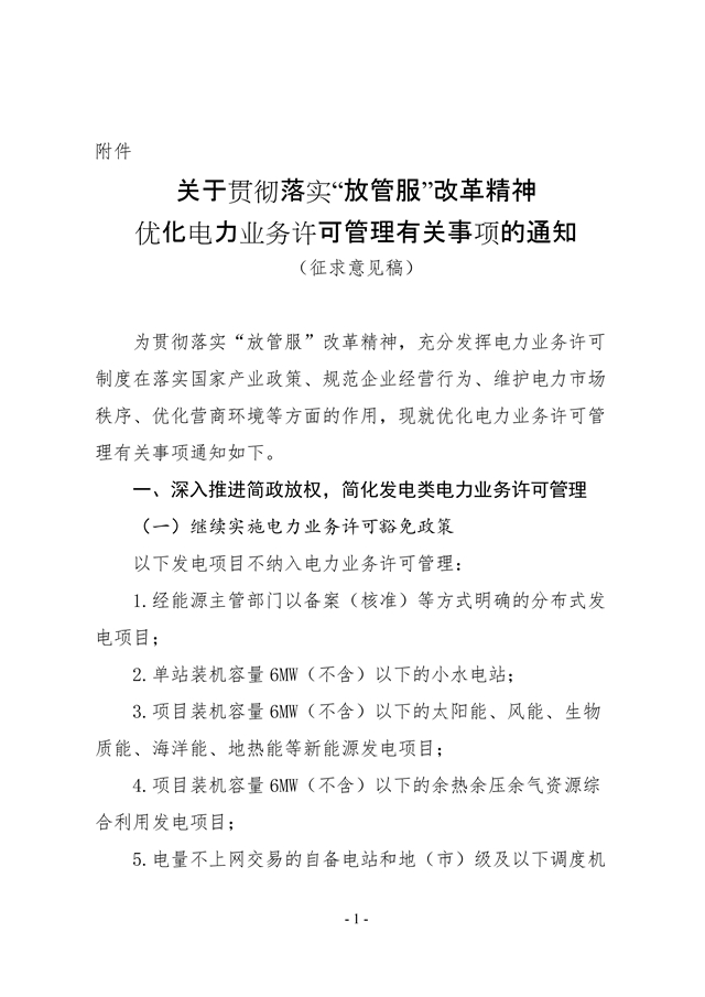 附件:關(guān)于貫徹落實“放管服”改革精神 優(yōu)化電力業(yè)務(wù)許可管理有關(guān)事項的通知(征求意見稿)