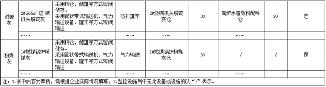 4.物料封閉輸送源清單。從物料輸送起點(diǎn)到終點(diǎn)建立清單,明確各排放源對應(yīng)的生產(chǎn)工藝環(huán)節(jié)、治理及監(jiān)控設(shè)施,注明治理設(shè)施主要性能參數(shù)及監(jiān)控設(shè)施安裝位置。