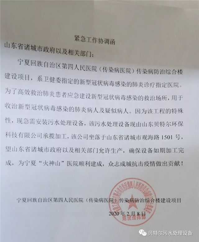 2019年底,臨近春節(jié),當全國人民沉浸在節(jié)日的祥和中時,一場突如其來來的疫情蔓延開來,陰云籠罩在神州大地。武漢告急!湖北告急!全國進入一級響應,各地紛紛伸出援手,一時間,應急物資源源不斷的運往武漢。疫情就是命令,作為一家以致力于環(huán)保事業(yè)的企業(yè),山東貝特爾環(huán)??萍加邢薰靖橇x不容辭,全員一心,共克時艱,為緩解疫情肆虐下醫(yī)院污水處理的巨大壓力,積極準備制作醫(yī)院污水處理設備。在接到寧夏回族自治區(qū)第四醫(yī)院(傳染病醫(yī)院)的求助信函時,第一時間組織員工,加班加點為寧夏第四醫(yī)院趕制兩套醫(yī)院污水處理設備,并于2月11日連夜運往寧夏,為寧夏“火神山”醫(yī)院順利建成,眾志成城抗擊疫情做出貢獻!中國加油!