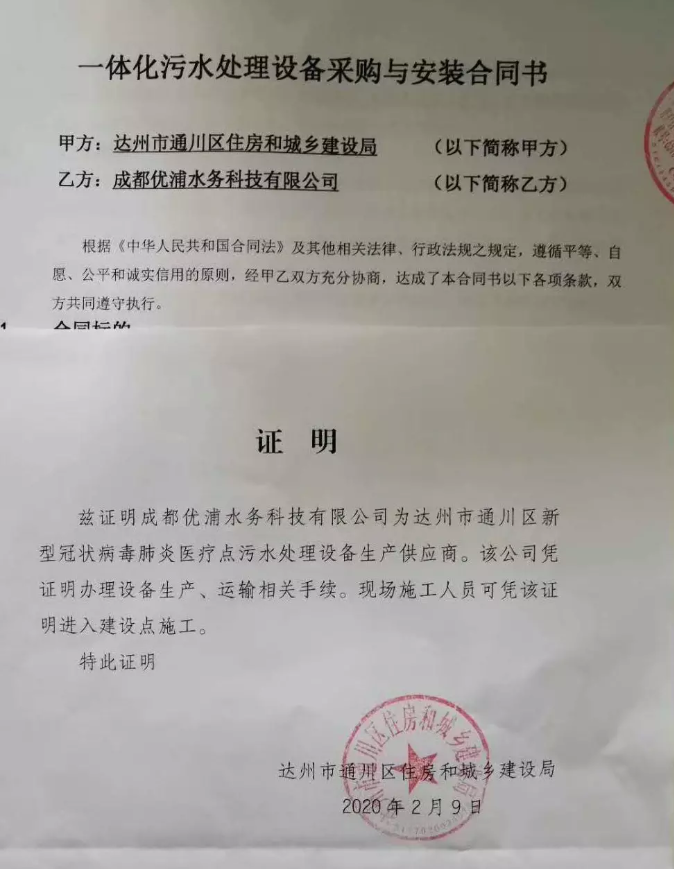 2月9日,因疫情防控需要,達州市通川區(qū)住房和城鄉(xiāng)建設(shè)局緊急指定優(yōu)普為達州市通川區(qū)新型冠狀病毒肺炎醫(yī)療點污水處理設(shè)備生產(chǎn)供應(yīng)商,目前已經(jīng)妥當(dāng)組織好設(shè)備生產(chǎn)和安裝、調(diào)試計劃。