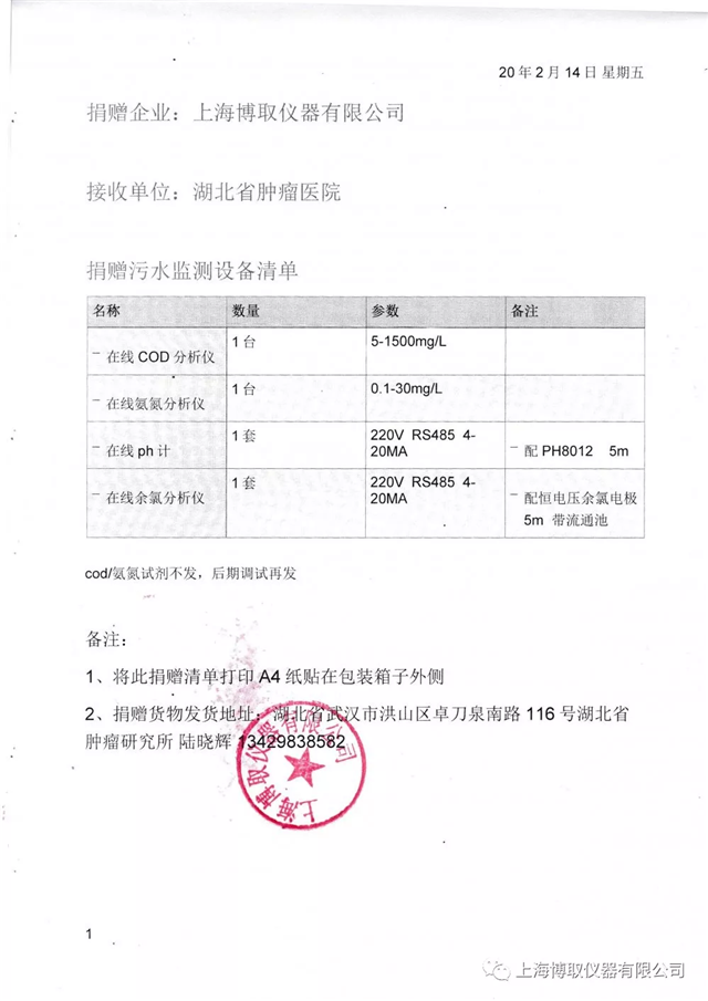 為更好地讓武漢當(dāng)?shù)蒯t(yī)院救治更多的患者,確保疫情消滅成果,堅(jiān)決打贏疫情防控阻擊戰(zhàn),上海博取儀器有限公司決定為湖北省腫瘤醫(yī)院捐贈(zèng)一批水質(zhì)監(jiān)測(cè)儀器儀表,在線COD分析儀、在線氨氮分析儀、在線PH計(jì)、在線余氯,作為一個(gè)有社會(huì)責(zé)任感的企業(yè),上海博取儀器堅(jiān)決跟隨國(guó)家腳步抗擊此次疫情,為了能讓武漢重見(jiàn)光明,也盡一份綿薄之力。