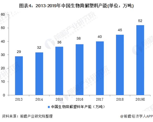 通過對國內(nèi)主要生物降解塑料企業(yè)投產(chǎn)項目產(chǎn)能初步統(tǒng)計,2019年中國生物降解塑料年產(chǎn)能在52萬噸以上,到2021年國內(nèi)生物降解塑料產(chǎn)能有望實現(xiàn)翻番。